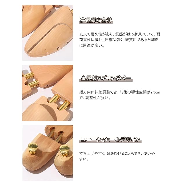 【高品質素材】当社のシューサポートは高品質の木材で作られています。この木材は美しさだけでなく、優れた性能も備えています。余分な湿気を吸収し、靴内の湿気を防ぎ、悪臭やカビの発生を減少させ、同時に靴に清新な香りをもたらします。