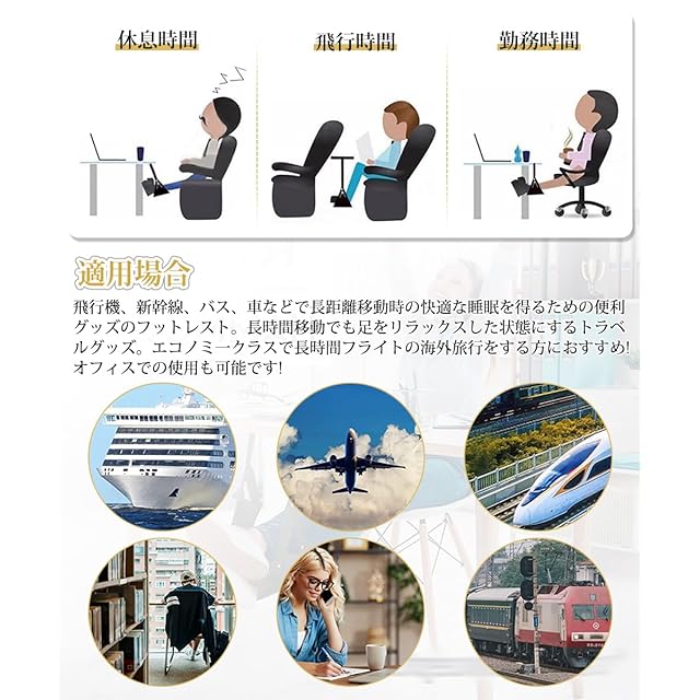 【適用場合】飛行機、新幹線、バス、車などで長距離移動時の快適な睡眠を得るための便利グッズのフットレスト。長時間移動でも足をリラックスした状態にするトラベルグッズ。エコノミークラスで長時間フライトの海外旅行をする方におすすめ!